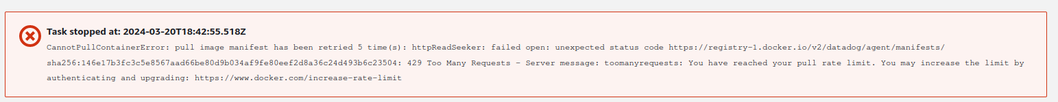 Well, the day that I needed to do something about it arrived. I’m setting up a Kong Gateway with Datadog images as sidecars. Both images are pulled from the Docker Hub. However, since the Kong Gateway container failed to start, when I was able to fix the configuration of the ECS Task Definition (because it keeps trying to start the containers until it does), I had reached the Docker Hub limits for the pulling of the Datadog image.
